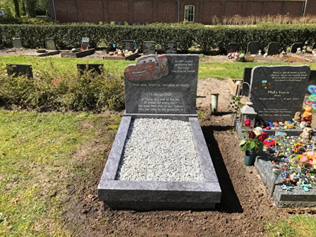 De grafsteen kan worden uitgevoerd in verschillende natuursteensoorten en kleuren, waarbij de Cars-afbeelding zorgvuldig wordt aangebracht als gravure of in kleur. Dit maakt het monument uniek en afgestemd op uw wensen.